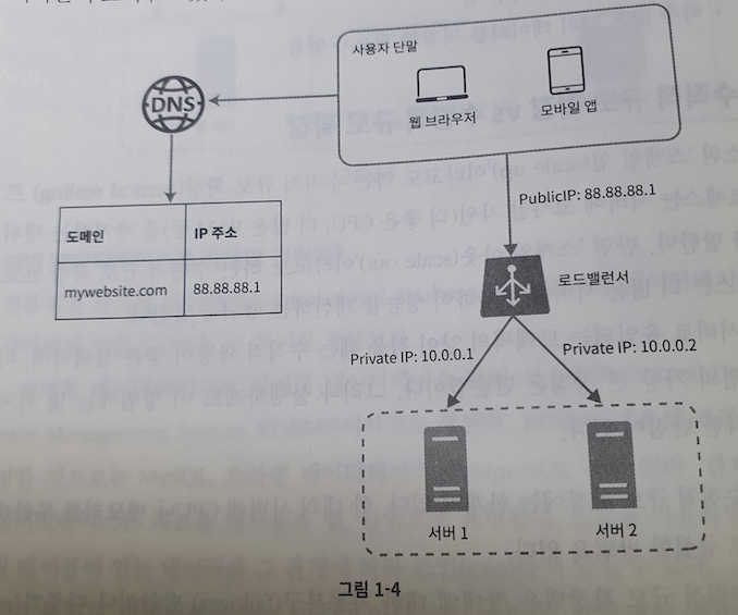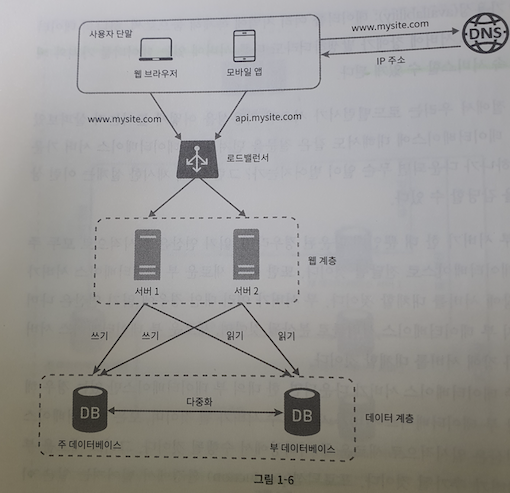 사용자가 늘면 서버 하나로는 충분하지 않다. 그래서 여러 서버를 두어야한다. 보통 트랙픽을 처리하는 서버와 데이터베이스용 서버로 분리하여 독립적으로 확장해 나갈 수 있도록 한다.