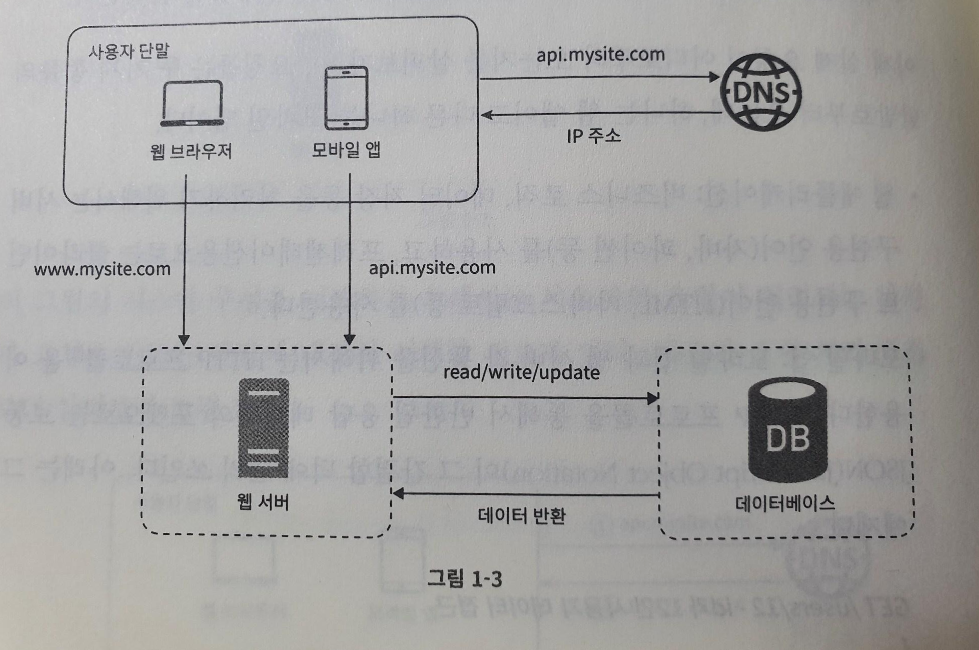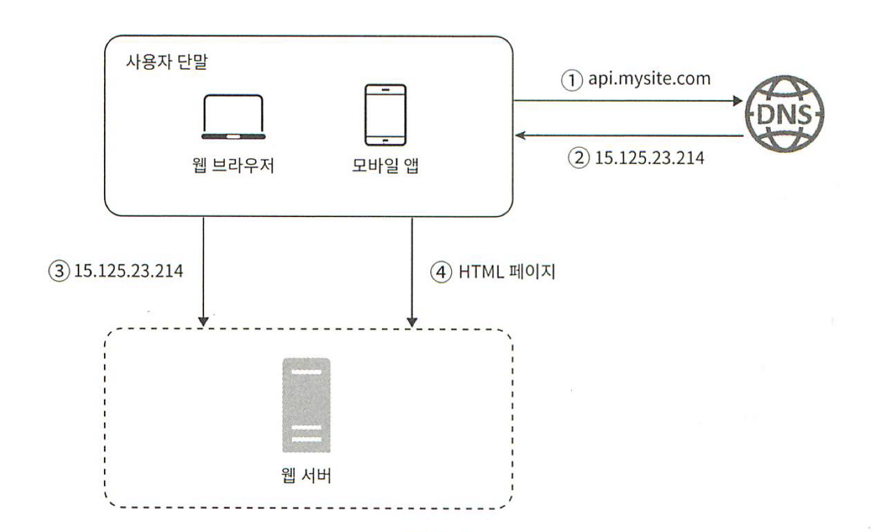 - 사용자는 도메인 이름을 이용하여 웹사이트에 접속한다. 이 접속을 위해서는 도메인 이름을 도메인 이름 서비스(DNS)에 질의하여 IP 주소로 변환하는 과정이 필요하다. DNS는 보통 제 3 사업자가 제공하는 유료 서비스를 이용하게 되므로 우리의 시스템 일부는 아니다.