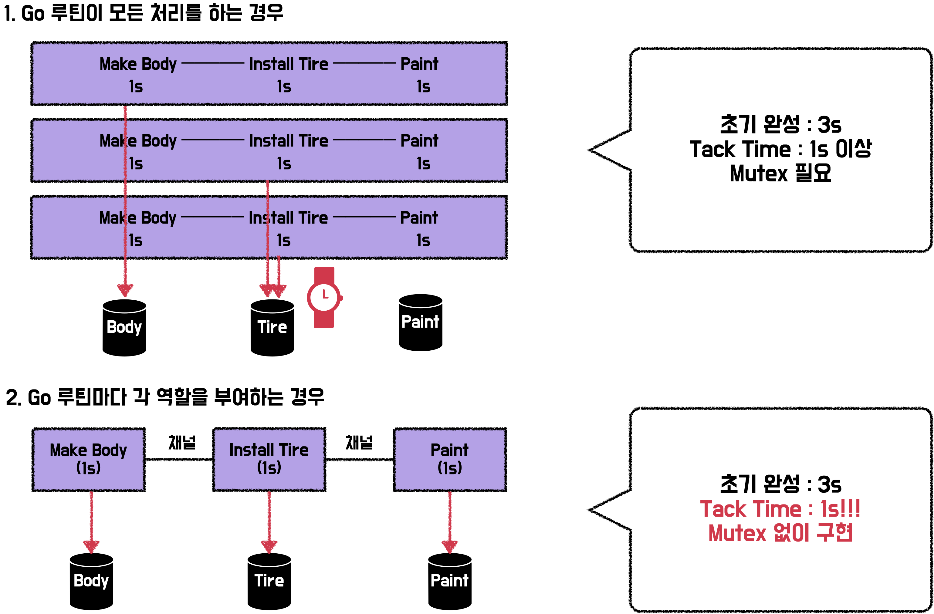 반면에 세 고루틴이 모든 공정을 맡아서 진행하면 경쟁 상태에 놓이게 되어 동시성 문제가 발생할 수 있고, 이로 인해